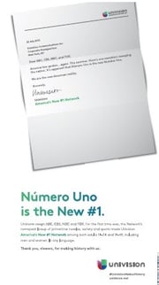 米視聴率調査会社ニールセンによれば、ユニビジョンの同月における同層プライムタイム平均視聴者数は181万人。150万人を下回ったCBS、Fox、NBCネットワーク、115万人に留まったABCを尻目に堂々首位となった。ユニビジョンはニューヨーク・タイムズ紙に「Numero Uno」(新しいナンバーワン)」と大きく掲げた全面広告をうち、祝賀ムードに湧いている。同ネットワークのセサ・コンデ社長はAP通信に、「ユニビジョンばかりかヒスパニック・メディアにとって画期的な出来事になった。また、ヒスパニック・コミュニティーの米国内における影響力が拡大していることを意味するものだ」と喜びを爆発させている。